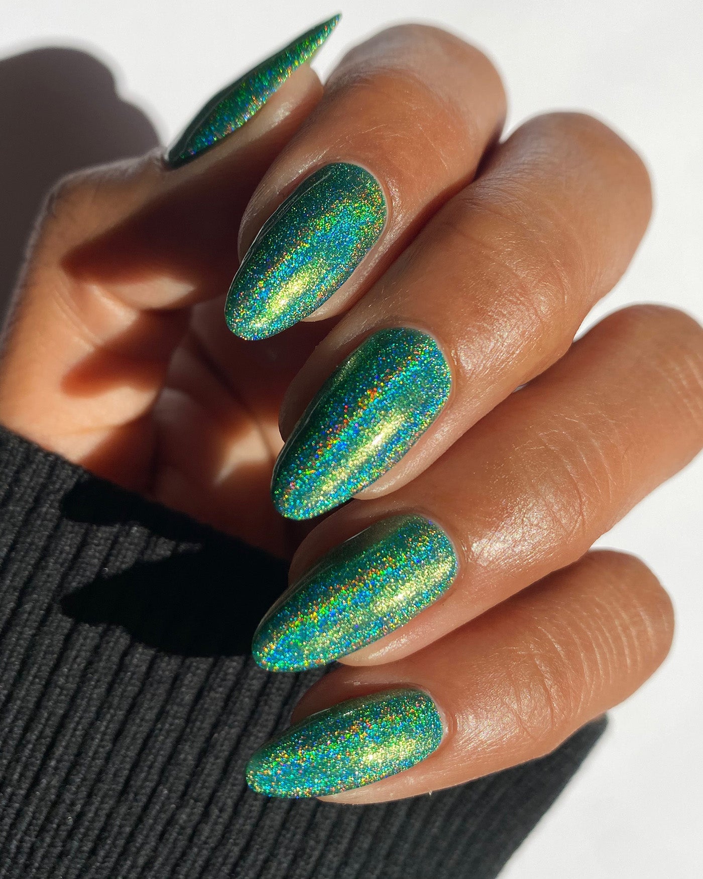 a universe of opportunity awaits you on the other side. it’s no stretch, this dark green linear holographic lacquer will rocket your style into the far-flung future.