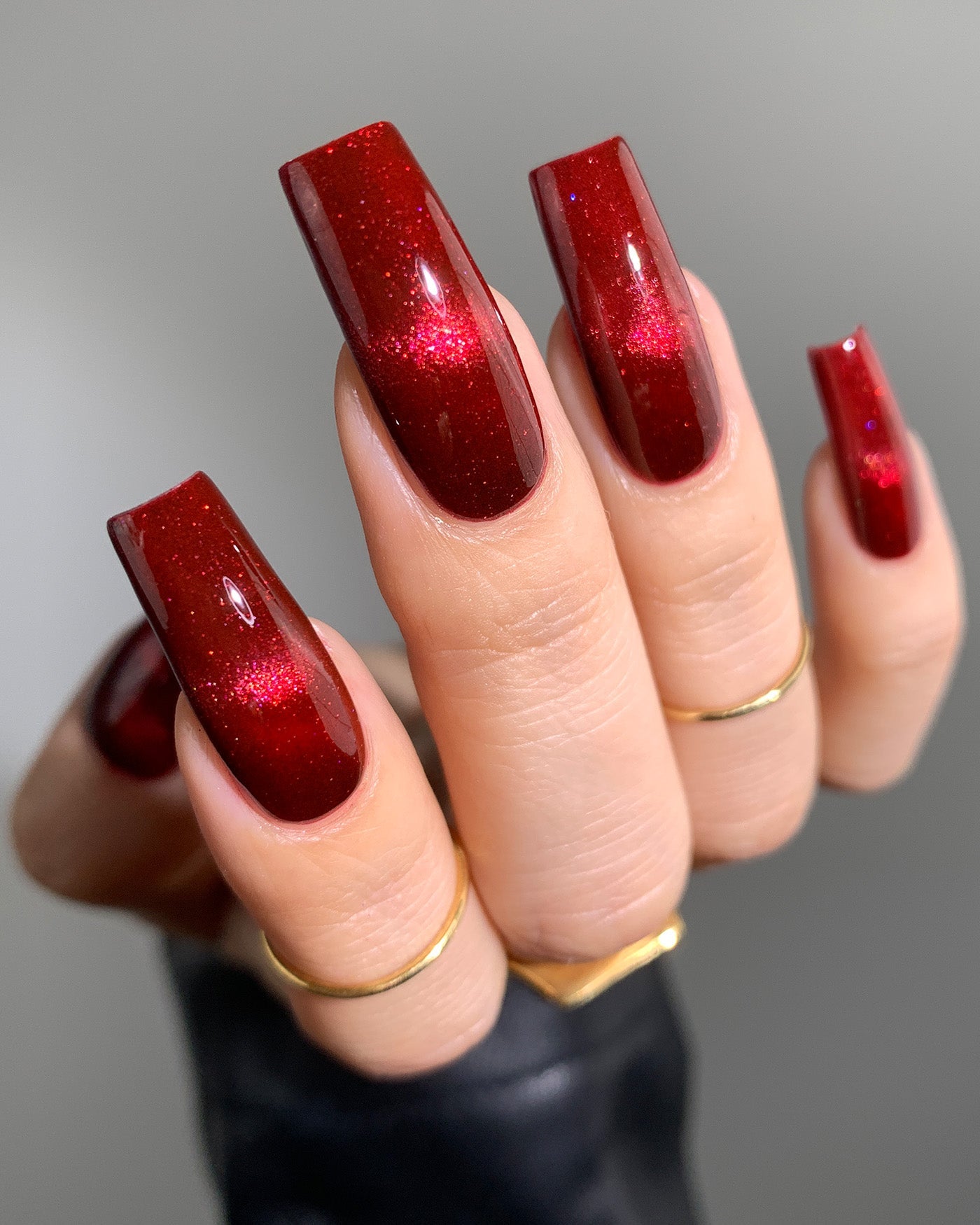 YOUR HEART’S A BLACK HOLE is a deep red magnetic lacquer filled with micro holo glitter that reveals a light red magnetic stripe.